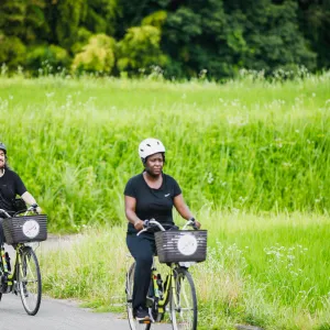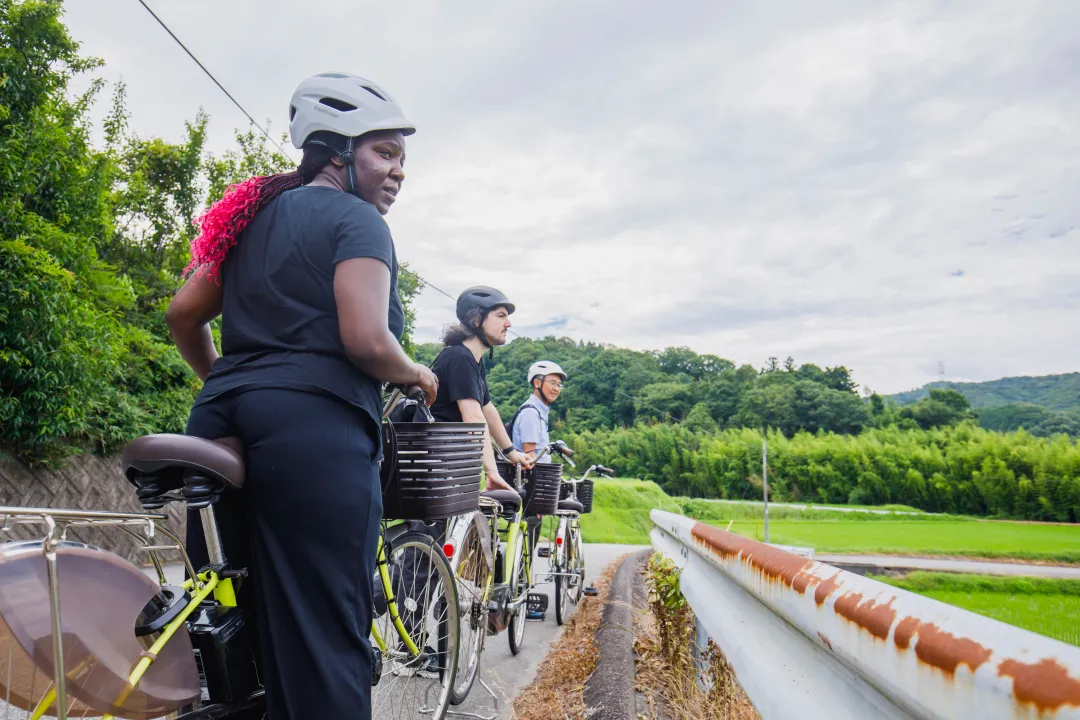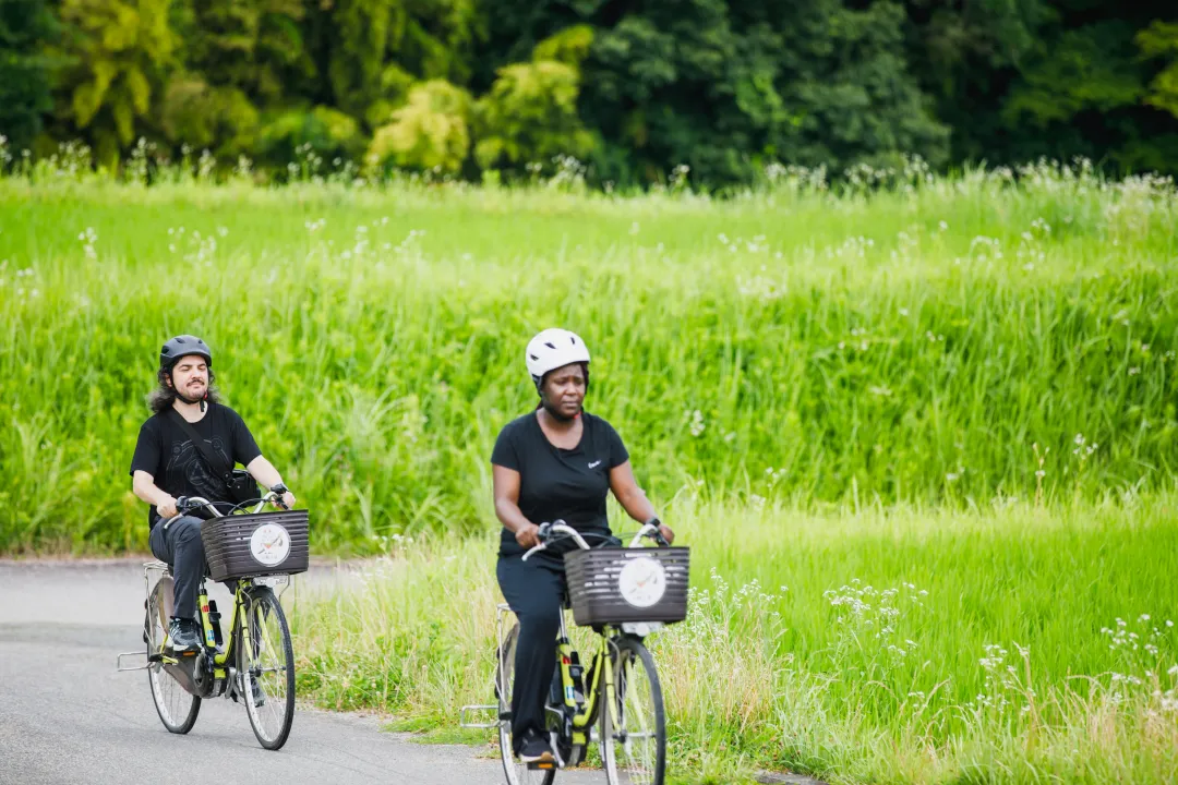 Enjoy the breeze as you cycle through the peaceful village on electric bikes